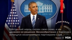 «Британский народ сказал свое слово, и мы уважаем их решение. Особые отношения между США и Великобританией сохраняются, и членство Британии в НАТО остается краеугольным камнем во внешней политике США, политике в сфере безопасности и экономики. То же можно сказать о наших отношениях с Евросоюзом, который сделал так много для продвижения стабильности, стимулирования экономического роста и поддержки распространения демократических ценностей и идеалов в Европе и за ее пределами. Соединенное Королество и Евросоюз останутся незаменимыми партнерами США, даже в тот период, когда они начинают договариваться по поводу их дальнейших отношений для обеспечения стабильности, безопасности и процветания Европы, Великобритании и Северной Ирландии и всего мира».