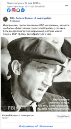 Как сообщает Радио Свобода, в общей сложности в феврале ФБР запустило три русскоязычных рекламных объявления, которые были размещены в Фейсбуке и Инстаграме. Объявление с фотографией Высоцкого в образе Глеба Жеглова сопровождается подписью: «Место встречи изменить нельзя. Нам есть о чем поговорить. Мы тоже любим Высоцкого».