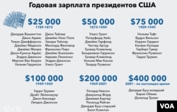 После того, как президент Гарри Трумэн переизбрался на второй срок в 1949 году, его зарплата выросла до 100 000 долларов. Через 20 лет эта сумма увеличилась еще в два раза: Ричард Никсон, избранный в 1969 году, стал первым президентом с зарплатой в размере 200 000 долларов. Нынешний размер зарплаты был утвержден в 2001 году после избрания Джорджа Буша-младшего.