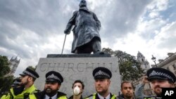 Перед намеченными на ближайшие дни новыми протестами статую Черчилля закрыли защитным экраном.