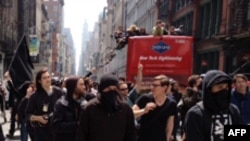 Несколько сот анархистов совершили несанкционированный марш-бросок по улицам Нижнего Манхэттена. Попытки полиции на машинах и скутерах заблокировать их движение не увенчались успехом – демонстранты передвигались трусцой или быстрым шагом по узким улочкам. Большая часть участников сейчас находится на Вашингтон-сквер. По разным сообщениям, арестованы около 20 человек.