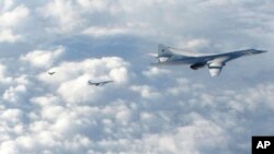 Министерство обороны России сообщило в Твиттере, что бомбардировщики «выполнили плановый 11-часовой полет над нейтральными водами Чукотского, Берингова, Охотского морей и северной части Тихого океана».